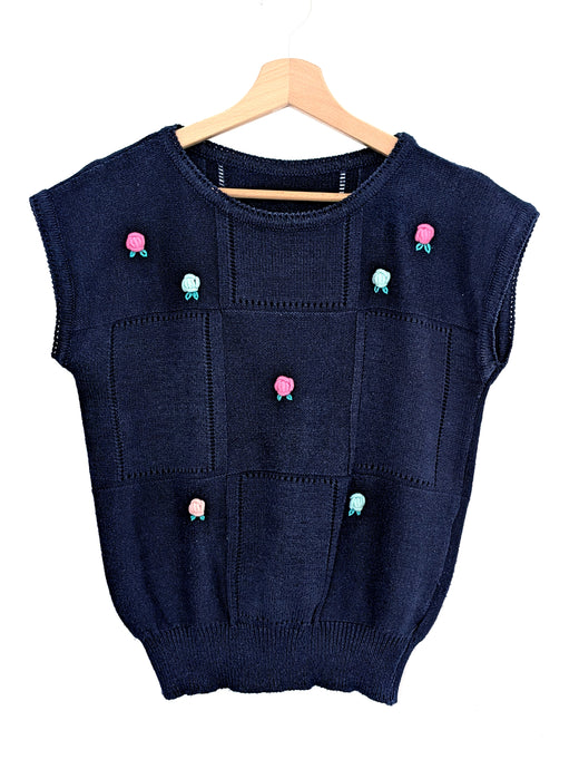 Navy Blue Short Sleeve Knitted Jumper with Flowers. Size 10