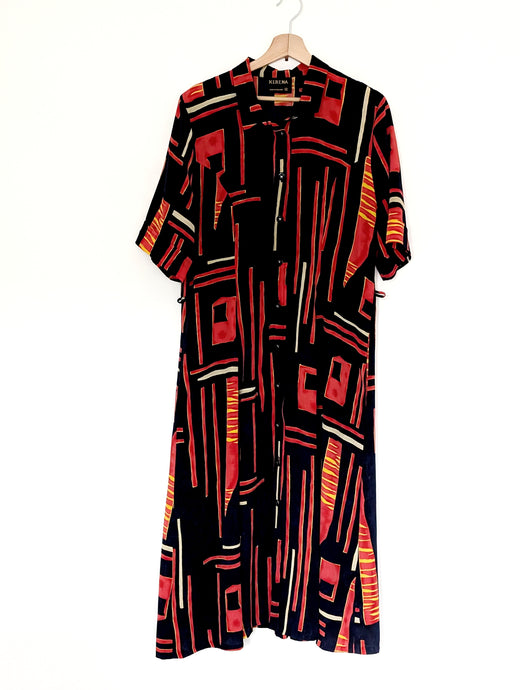 Long Navy Blue, Red and Yellow Button Down Vintage Dress. Size 18